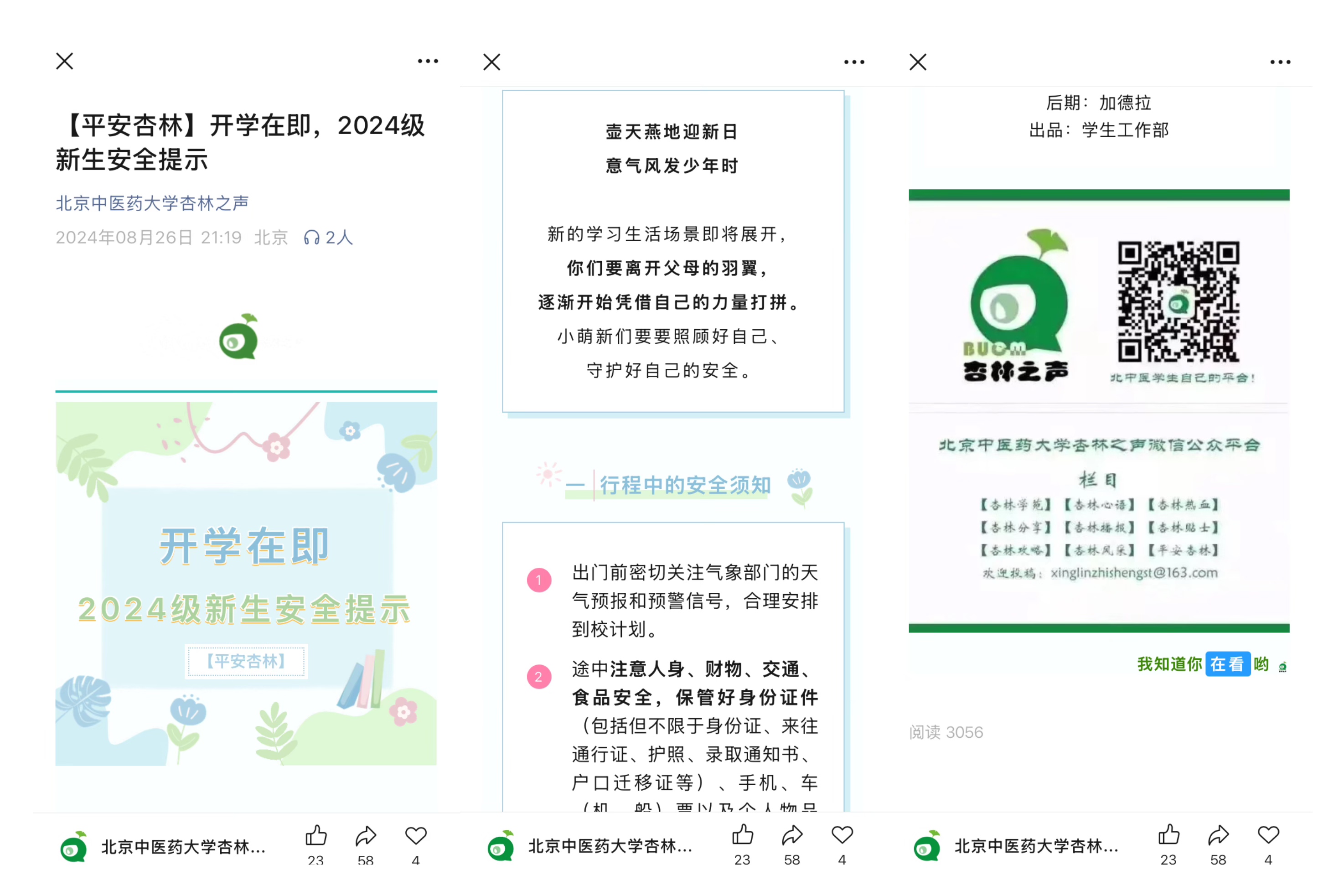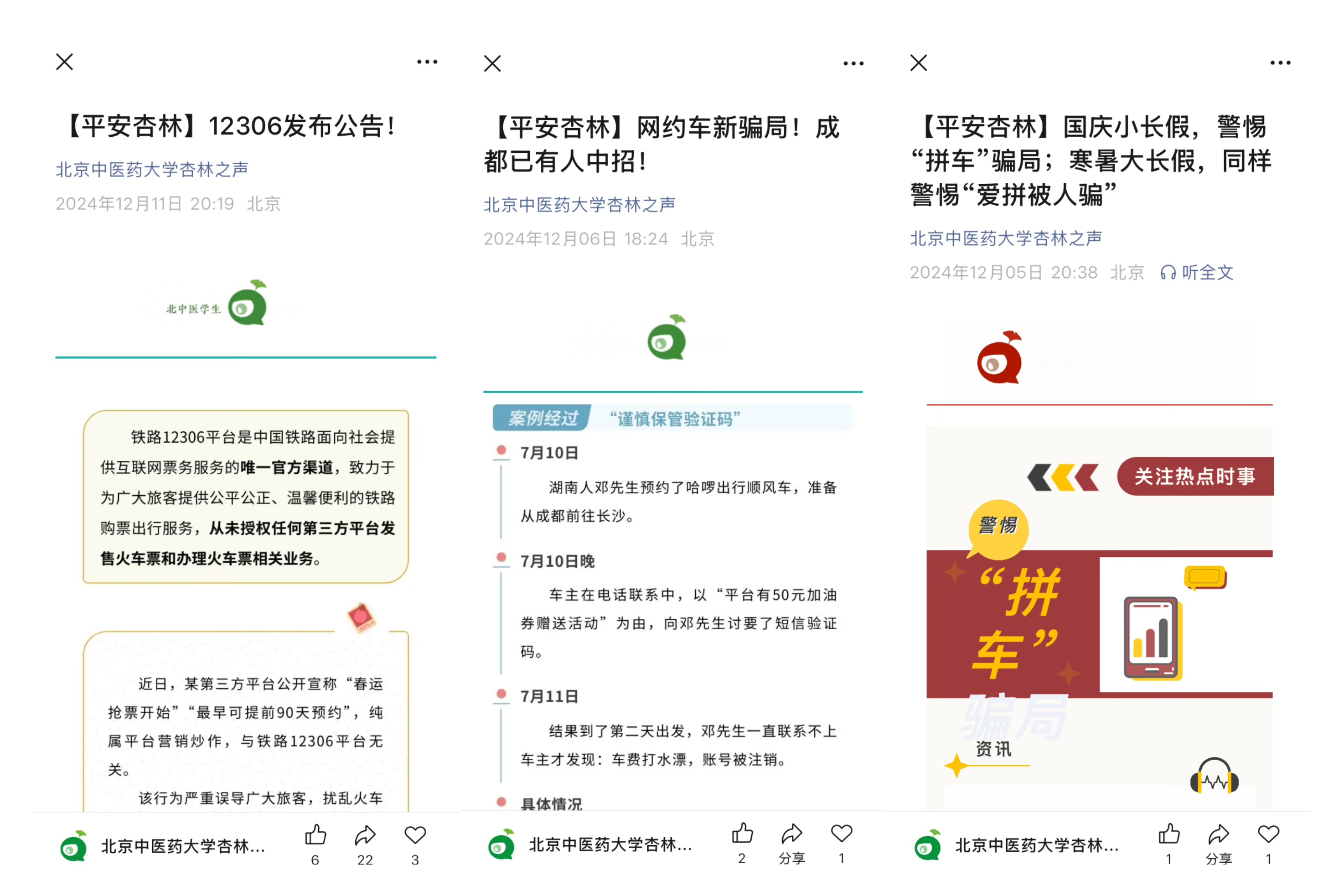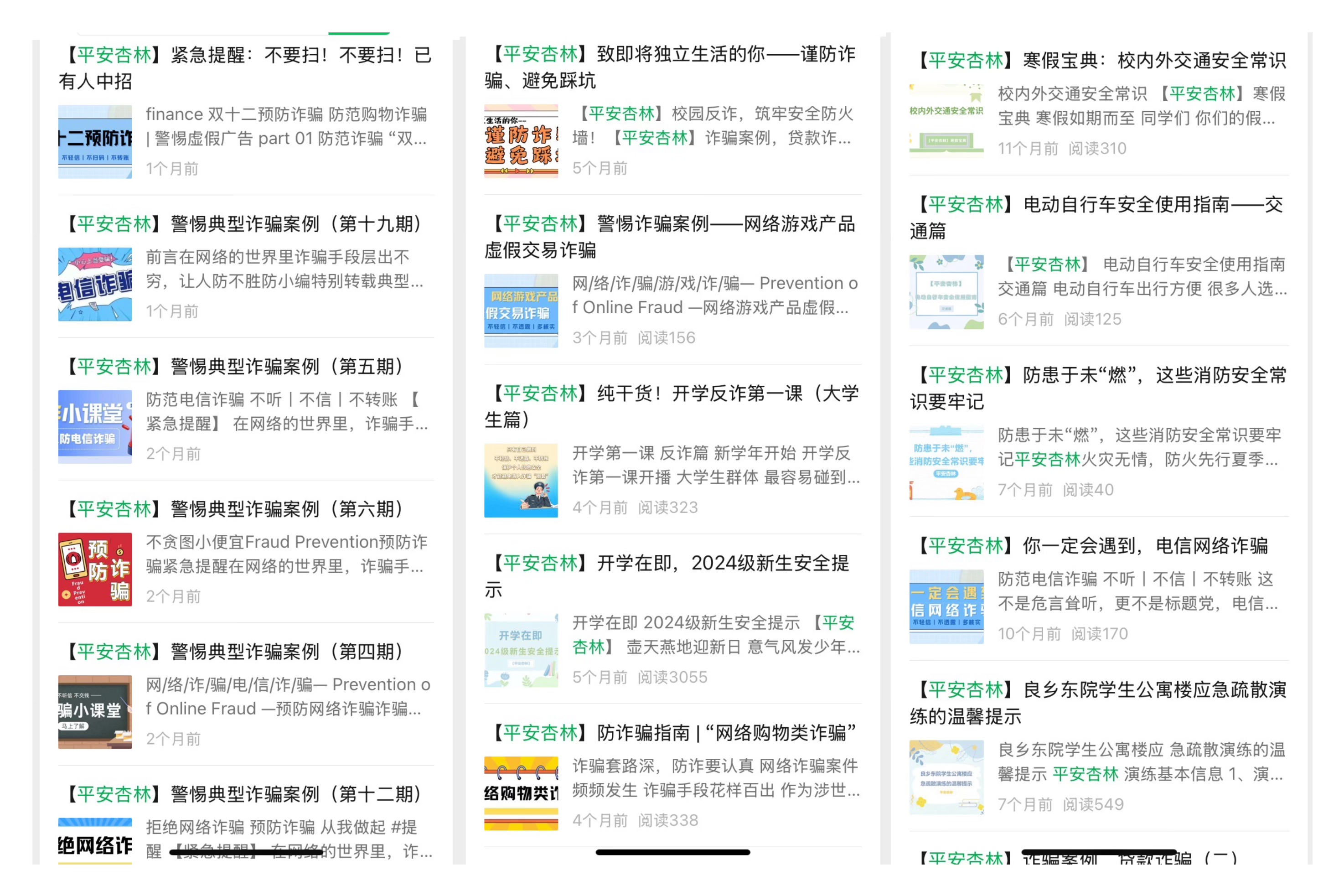 2024年下半年以来,“一站式”学生社区党委、学工部重视运用新媒体微平台开展安全知识宣传。摸索安全知识内在逻辑,原创推文;广泛关注权威信源,转发精彩内容;注重知识迁移,综合总成设计专题。累计通过杏林之声新媒体平台发布推文60余篇,聚焦离校返乡、开学返校、十一假期等重要时间节点,以及宿舍安全检查情况,发布知识科普类原创推文10篇,第一时间转载权威媒体推文20余篇,结合网络热点与校园实际情况,发布安全提醒类推文30余篇。微平台宣传内容涵盖反电诈、消防、交通、用电、网安、食安等常见安全隐患的重点、难点和问题点,灵活掌握时机,紧跟社会关注趁热打铁,以热点牟关注,以关注带宣传。通过纵向“学工-学院-班级”、横向“校区-楼宇-寝室”两条链路层层转发,构筑起立体化校园安全宣传矩阵,实现广泛传播,推动校园安全防线走深走实。