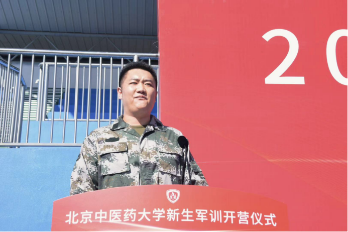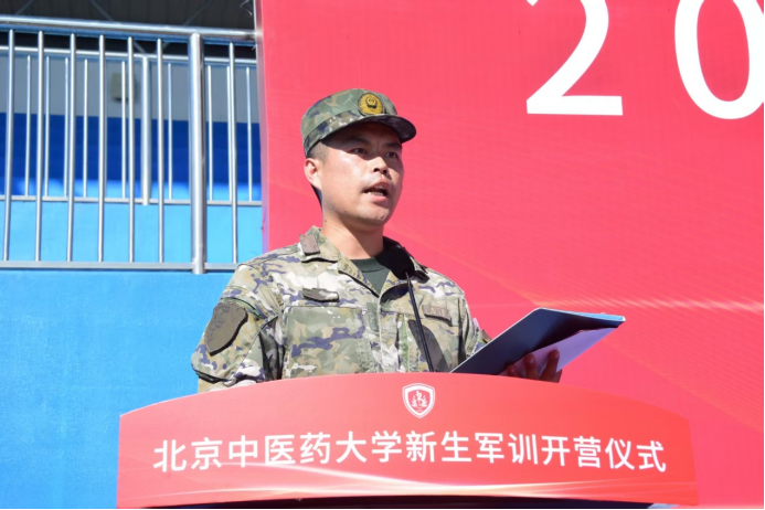 中医学院专职辅导员陈万义作为军训指导员代表发言。他说军训是大学第一课,更是开展国防教育和爱国主义实践的重要契机。指导员们将与参训学员一起铭记历史、缅怀先烈、珍爱和平、开创未来,协同施训、严格管理、关心学生,保证顺利圆满完成军训任务。