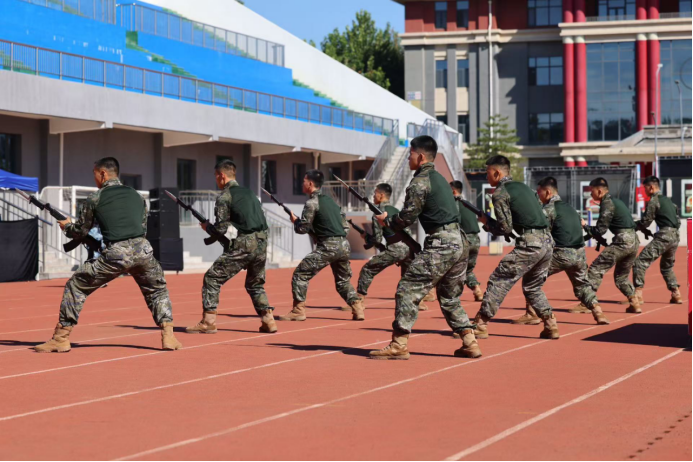军训教官团队还演练了精彩的特色科目,展现出过硬的军事素养与昂扬的精神风貌。全体新生整齐列队观摩,表演过程掌声不断,气氛热烈。让隆重而严肃的军训开营式平添了动感与激越。