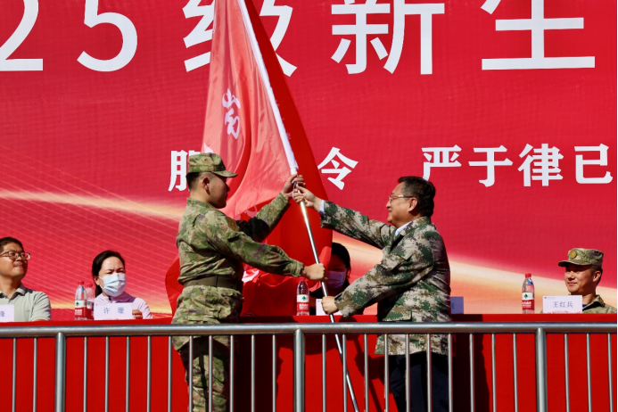 军训团政委赵建磊宣布yl6809永利线路检测2025级军训团领导任职决定,希望教官与指导员同志们服从命令,履行职责,坚守岗位,扎实工作,为圆满完成新生军训任务保驾护航。王停副校长代表学校党委向军训团团长授旗,标志着2025级学生军训正式开营启训。