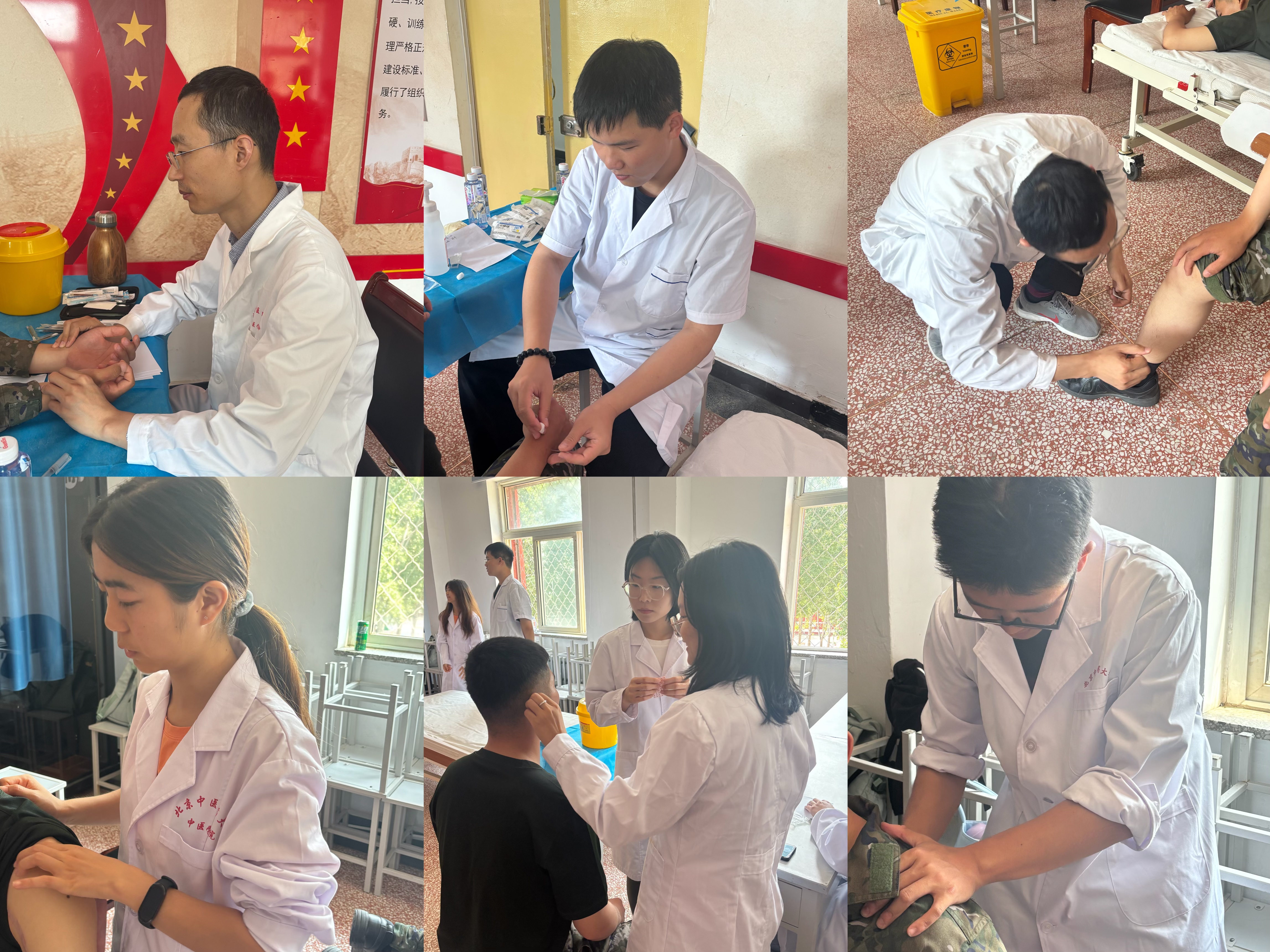 当天上午,参与义诊的师生们早早抵达部队,迅速搭建起临时诊疗点。活动现场,前来问诊的士兵络绎不绝。中医专业的学生们凭借所学知识,为士兵们进行了细致的中医问诊,通过望、闻、问、切,全面了解他们的身体状况,并根据每个人的具体情况开具个性化的调理方案。针灸和推拿专业的学生则运用熟练的手法,为患有颈肩腰腿痛等常见训练伤的士兵进行针灸和推拿治疗。他们精准取穴、手法娴熟,有效缓解了士兵们的疼痛和不适。
