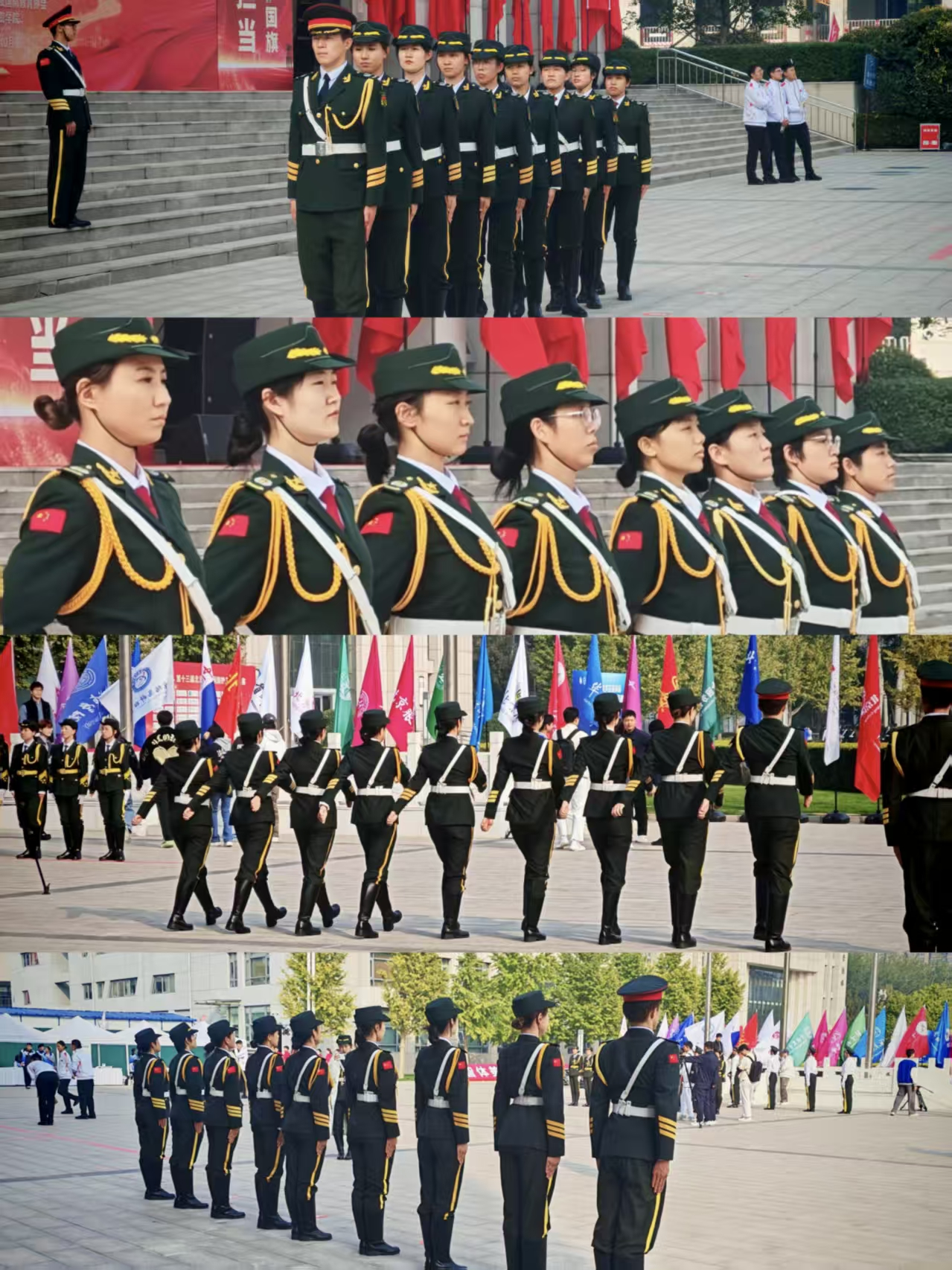从齐步入场到正步行进,从展旗的庄严肃穆,到敬礼动作的整齐划一,这不仅是技艺的切磋,更是对国旗护卫精神的生动传承。各高校护卫队以旗会友,在交流中共同成长,将“护旗护国”的信念深植于心。比赛当日,队员们精神抖擞,气势如虹。以最饱满的状态完成了每一个规定动作。齐步转正步的干净利落,升旗仪式中的庄重威严,收旗动作的严谨规范,每一个细节都展现信念和风采。