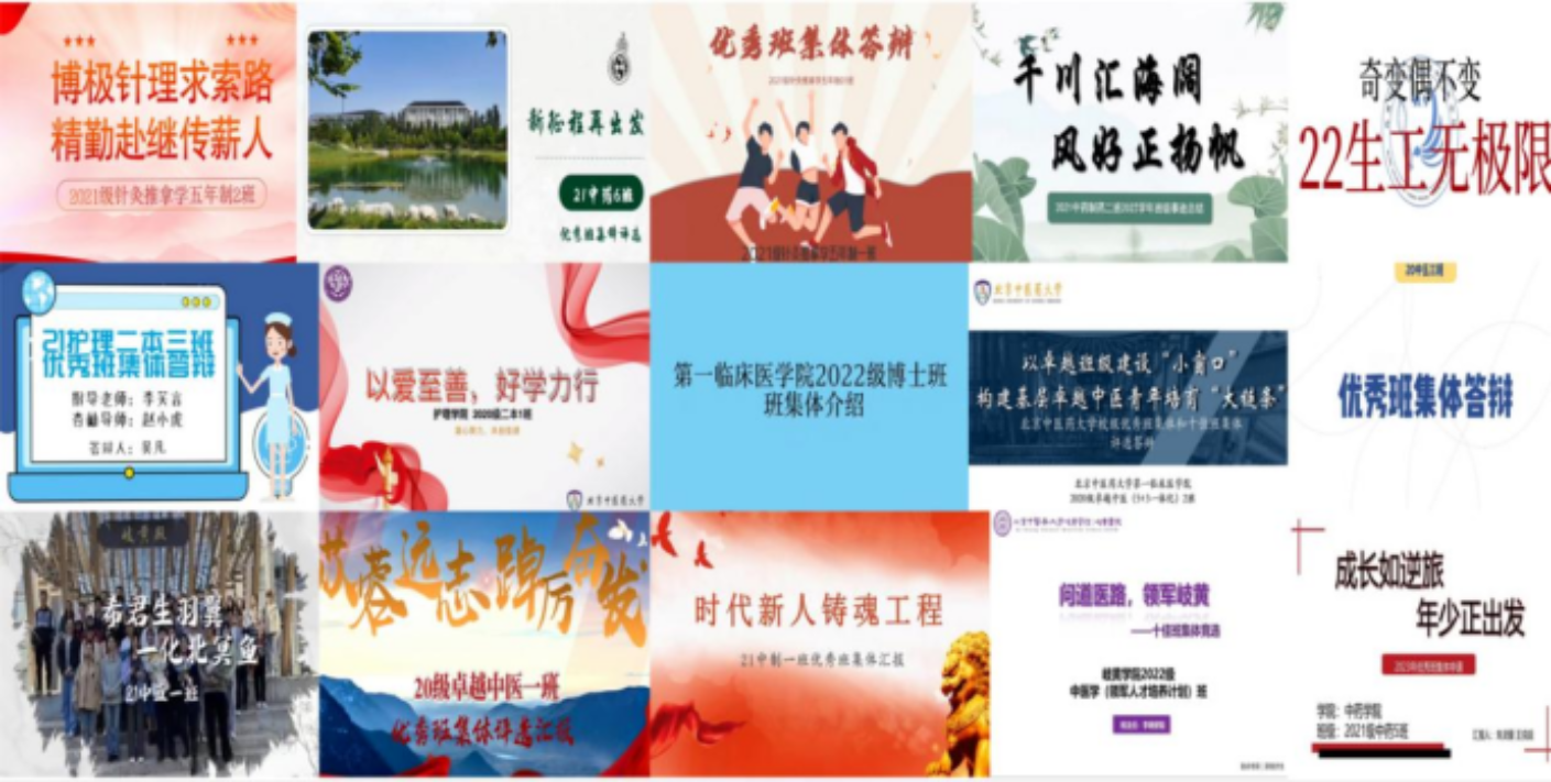 经学院初评、校级终评,最终进入本次校级评选展示环节的班集体共有15个,他们分别来自8个学院。15个参评班级按照抽签顺序依次进行了班级风采展示,各参选班级从思想建设、学风建设、班级文化、社会实践等多方面进行了精彩的阐述,一些班级还加入了人物表演、实物展示和班歌班服展示等特色展示内容,充分展现了北中医学子的活力与优秀。