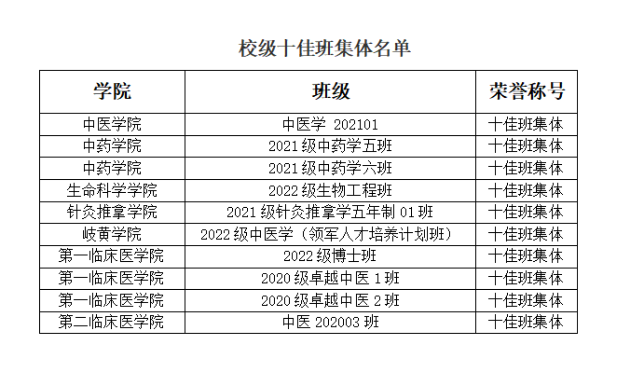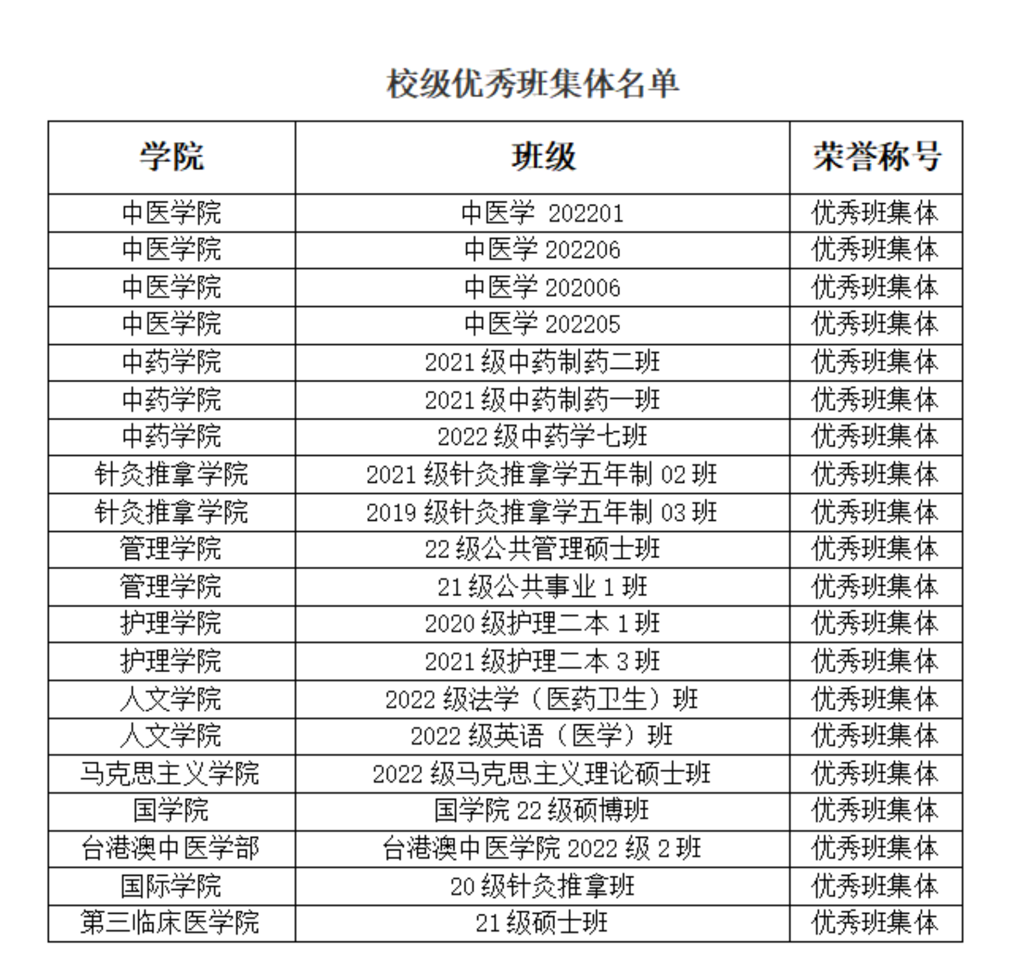 为学习贯彻习近平新时代中国特色社会主义思想和党的二十大精神,落实立德树人根本任务,全面落实“时代新人铸魂工程”,充分发挥我校班级在促进学生思想政治教育、服务学生全面发展中的积极作用,交流经验,宣传典型,经学院初评、学校终评,现将2022-2023学年校级优秀班集体和十佳班集体评选结果公示如下(排名不分先后):