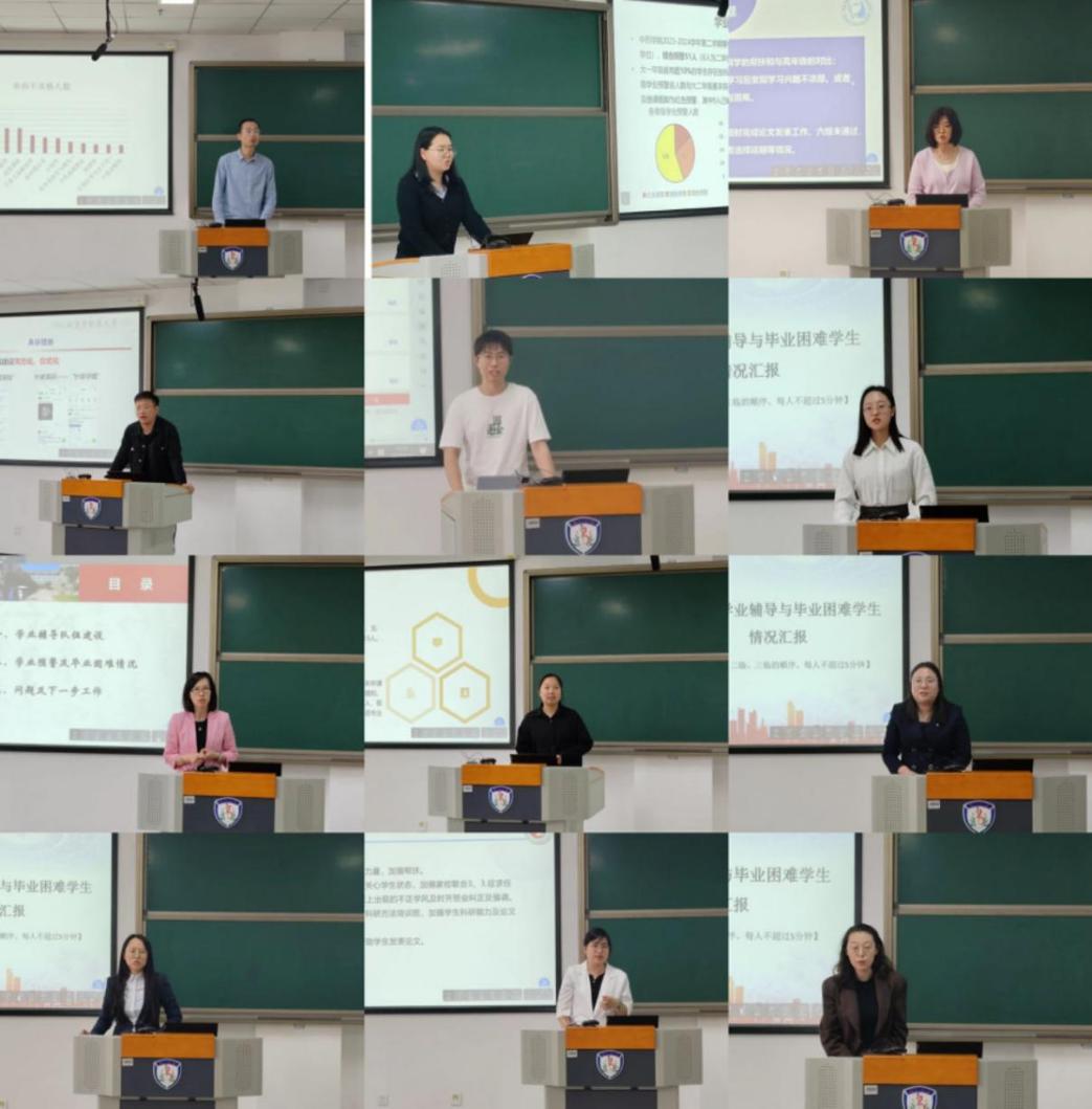 接下来的毕业生学业工作专题汇报环节,学工部赵娜副部长就我校2023-2024学年学业辅导工作、2024年毕业困难学生情况等内容进行了总体介绍。各学院副书记和学业辅导工作专员分别就本学院2024届毕业困难学生情况及干预措施进行了工作汇报,对学业辅导工作中存在的困难、指导与帮扶工作的重点难点进行了分析研判。