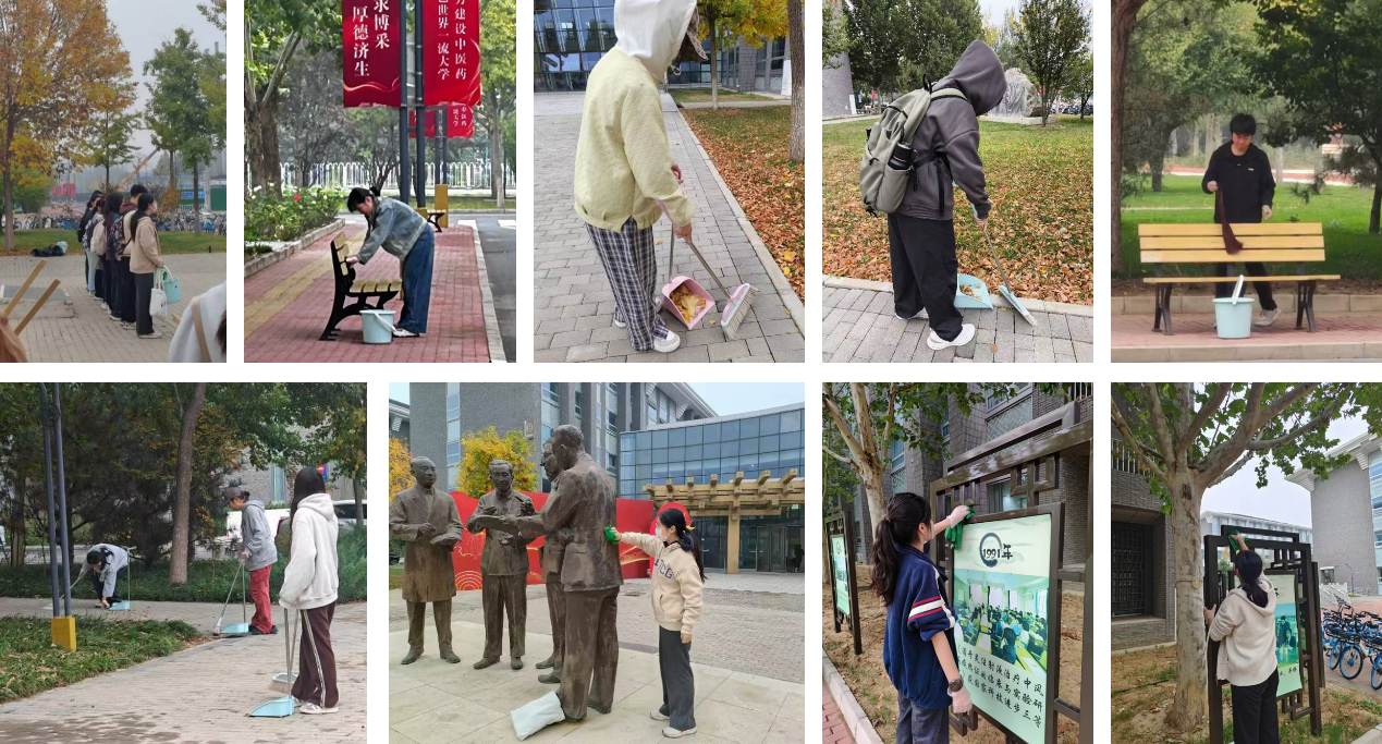 在劳动现场,同学们身穿统一的志愿者服装,手持扫帚、垃圾袋、抹布等工具,分工明确,配合默契。有的负责清理树叶,他们细心地清扫着每一个角落,确保落叶归堆、垃圾入袋;有的负责捡拾垃圾,他们穿梭于校园小径、草坪之间,不放过任何一片纸屑、一个塑料瓶;还有的负责擦拭雕塑及建筑物,他们利用湿抹布、清洁剂等工具,对校园内的雕塑、宣传栏、教学楼外墙等进行了全面清洁,使其焕然一新。