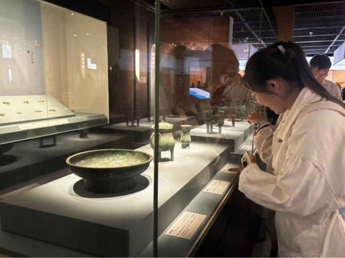 展厅内的青铜器群成为核心焦点——作册般青铜卣的细腻纹饰、伯矩鬲的雄浑造型、克盉的精巧工艺,不仅展现了西周时期卓越的铸造技艺,更承载着先民的审美追求与精神信仰。沿展线深入,图文展板与考古视频系统梳理了琉璃河遗址的发掘历程:从1962年伯矩鬲的意外发现,到2021年M1902小型贵族墓的新突破,每一次考古成果都像一把“钥匙”,解锁燕国历史的未知篇章。同学们深刻认识到,琉璃河遗址不仅是北京三千余年城市文明的“活化石”,更是京津冀文化同源、协同发展的历史见证,为理解“中华民族多元一体”格局提供了生动例证。