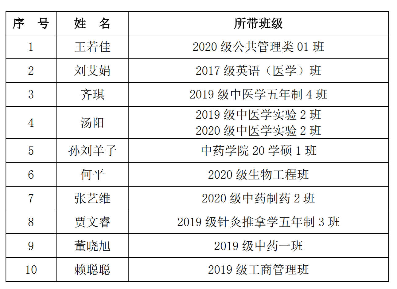 为了深入贯彻落实党的十九大精神、十九届六中全会、全国教育大会、全国高校思政工作会议和习近平总书记重要讲话精神,巩固“立德树人”理念,切实构建“融合联动式”的大思政、大德育格局,加强学生工作队伍建设,调动全校班主任工作积极性、创造性。根据《关于开展2020-2021学年全校班主任评优工作的通知》(京中学函〔2022〕2号)要求,经校院两级考评,现将我校2020-2021学年十佳班主任评选结果公示如下(按照姓名音序排列):
