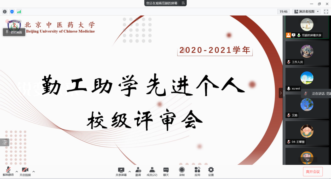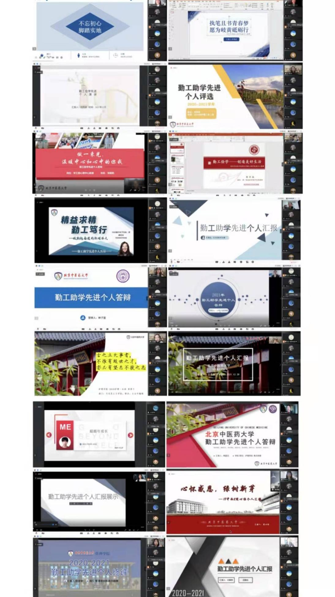 经个人申报、用工部门推荐,共有54名同学参加2020-2021学年勤工助学先进个人评选。经专家函审,共有来自8个学院的18名同学进入校级评审环节。本次校级评审采取线上答辩模式,候选人按照抽签顺序依次答辩。答辩过程中,每位同学就工作内容、工作中困难和收获以及对未来工作的展望进行了分享与答辩,展示了北中医学子朝气蓬勃、自信向上的青春风采。