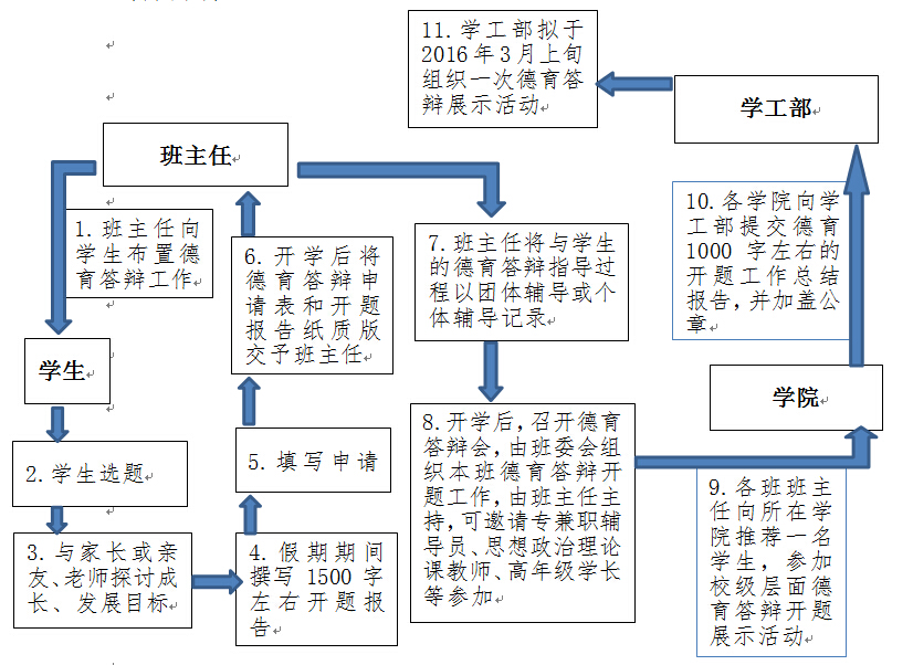 鉴于学生成长成才的多元化需求,德育答辩工作不设置固定选题,各班可设立集体选题,学生个人也可独立选题,但要做到有始有终。