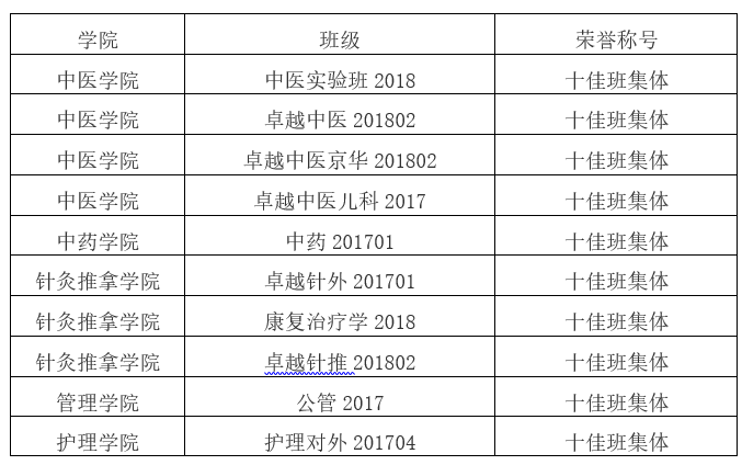 为规范学校班集体管理,助力班集体发展,充分调动优秀班集体在校园文化建设中的模范带头作用,营造校内创先争优的良好氛围,经学院初评、学校终评,现将2018-2019学年本科十佳班集体评选结果公示如下: