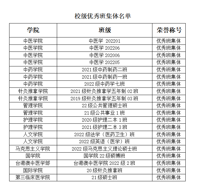 为学习贯彻习近平新时代中国特色社会主义思想和党的二十大精神,落实立德树人根本任务,全面落实“时代新人铸魂工程”,充分发挥我校班级在促进学生思想政治教育、服务学生全面发展中的积极作用,交流经验,宣传典型,经学院初评、学校终评,现将2022-2023学年校级优秀班集体和十佳班集体评选结果公示如下(排名不分先后):