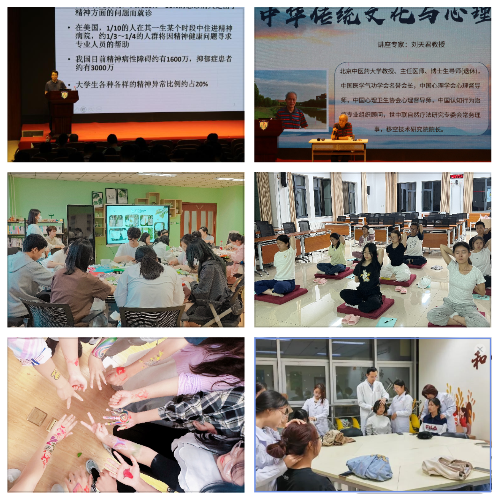 学工部大学生心理健康教育与咨询中心精心策划,采用校院两级工作模式,在近三个月时间里举办主题讲座、“知子清心”系列心理沙龙、“萤火微光”表达性艺术朋辈团体辅导(7场)、“甘甜入梦”中医呵护睡眠推拿服务、“以体强心”八段锦健体养心活动、“以美润心”墨香怡情书法绘画疗心活动、“以劳健心”养心药膳DIY体验、“以音疗心”中医五音疗法体验等心理健康教育活动共七大 项,各学院结合资源优势与学生需求举办特色心理文化季活动 46 项,共覆盖学生11347人。