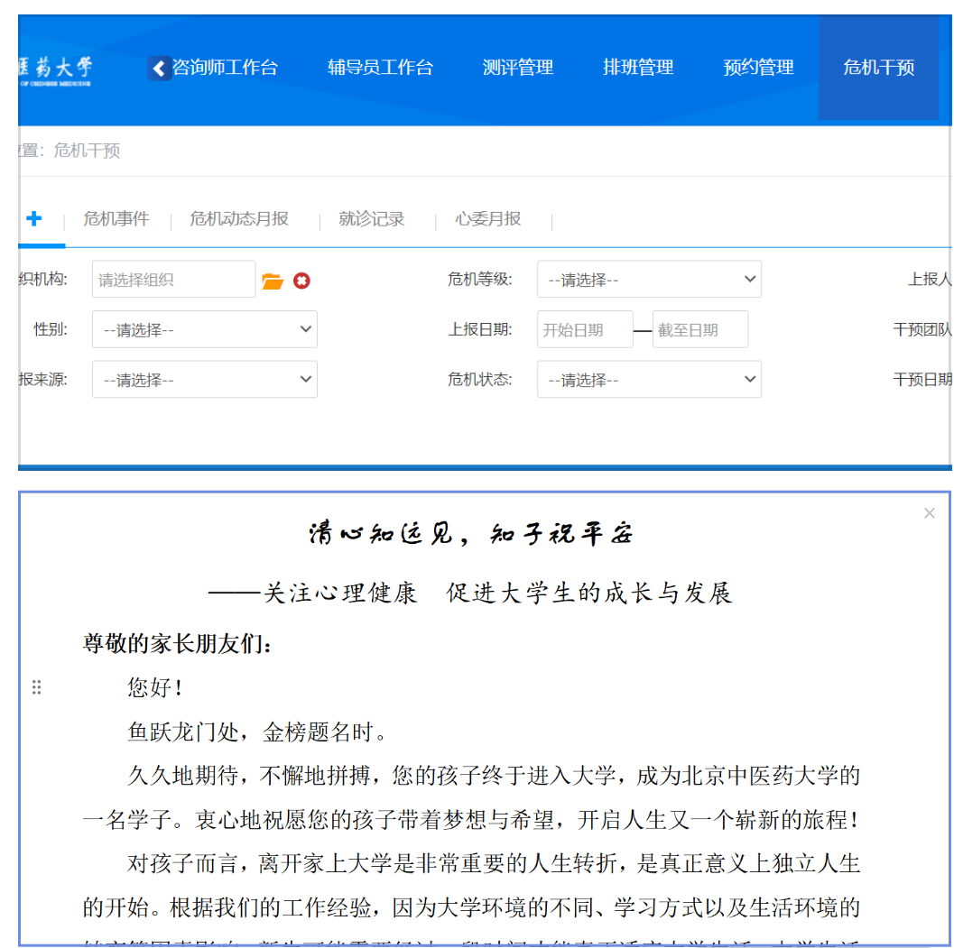 起草致新生家长的一封信《清心知远见,知子祝平安——关注心理健康 促进大学生的成长与发展》,从角色转变、人际关系、情绪疏导、压力管理、有效沟通、正视心理问题、运用专业资源等多个方面,向新生家长普及心理健康常识、提示心理帮扶渠道,以求共同做好新生心理健康工作。