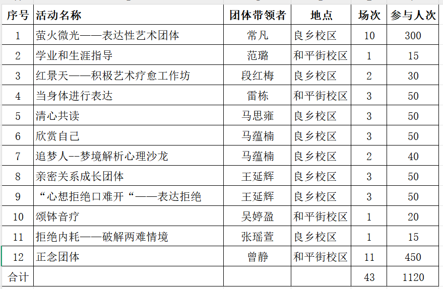 期末季,学生常面临学业、考试等多重压力,情绪波动也愈发明显,为帮同学们在这段关键时期保持良好心态,从容面对压力,学工部大学生心理咨询中心精心策划并举办了丰富多彩的期末季系列团体活动,助力学生心理调适与成长。此次活动从12月7日持续至1月20日,内容涵盖情绪调节、学业压力、焦虑应对、拖延应对、人际关系、自我探索、身心照顾等大学生十分关注的心理议题,共计举办团体活动43场,参与学生1120人次,活动带领者为我校专兼职咨询师与知子清心工作室骨干教师,活动形式丰富多彩,采用正念练习、表达性艺术、颂钵体验、心理读书会等,全方位满足学生心理需求。