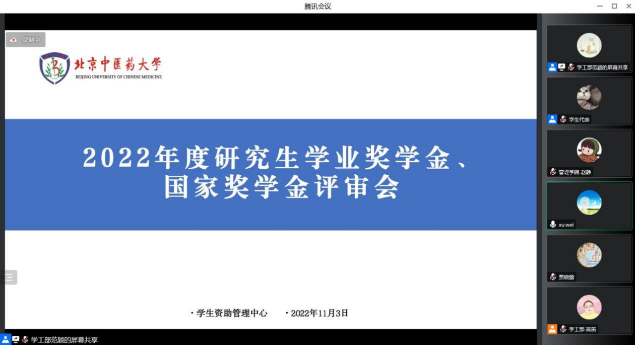 2022年11月3日上午,因疫情防控原因,学工部学生资助管理中心线上组织召开我校2022年度研究生学业奖学金、国家奖学金评审会,对各学院及培养单位推荐上报的学业奖学金与国家奖学金评选结果进行评审和表决。校党委副书记张继旺,研究生院常务副院长张立平、财务处处长洪宝林,学生工作部部长范璐,各学院学生工作分管领导等我校学生奖助学金评审委员会成员以及辅导员、学生代表参加了此次评审会。本次会议由学工部副部长徐巍主持。
