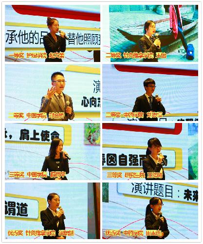 本次演讲比赛的主题是“使命 传承 未来”。首先,伴着一段参赛选手的展示视频,拉开了此次比赛的序幕。演讲比赛中的选手们在台上讲述了自己的心路历程和奋斗故事,以最真实、最诚挚的情感打动了在场的每一个人。现场气氛活跃,掌声此起彼伏,同学们深受鼓舞。梁毓恬同学的“中医传承之谓道”、王怡同学的“为义诊发声,为中医药发声”、薛雨辛同学的“心上传承,肩上使命”、邹金桥同学的“心向志愿,春暖花开”从不同角度讲述了北中医人对中医药事业的使命、传承与未来;刘志恒同学的“唤醒使命”、田玉连同学的“未来已来”、王海瑜同学的“青春因自强而飞扬”、赵文蕾同学的“替代他的角色,传承他的品质,替他照顾我”,从自身角度讲述了自己的奋斗历程与展望,充分体现了自立自强的北中医人形象。