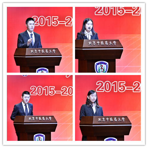 大会第四项,优秀学生代表上台发言。2016级博士研究生陈光从立志、明心、养德三个方面分享了他成长、成才,最终获得研究生国家奖学金的经验;2013级药学班孙墨涵同学在“仰望星空的同时,不忘脚踏实地”,并获得了本专科生新奥精华奖;2012级卓越中医师班靳嘉麟作为优秀学生干部代表,引用习近平主席提出的“有理想、有追求、有担当、有作为,有品质、有修养”六有大学生的思想,提出优秀学生干部应该更有担当,更有修养,这样才能更好的服务学生;珍惜班级内每一位同学的闪闪星光,汇聚成班集体的灿烂星河, 2013级中医学(卓越针推对外)班用属于他们自己的故事展示了针推对外班“针知卓建、推本求源”的班训;第四届自强之星代表,2014级卓越中西医2班的贾元萍同学,用自己自立自强、与命运抗争的励志人生,感动了在座的每一位观众。