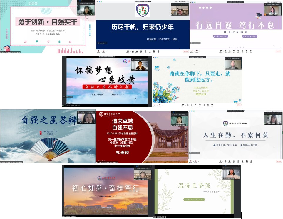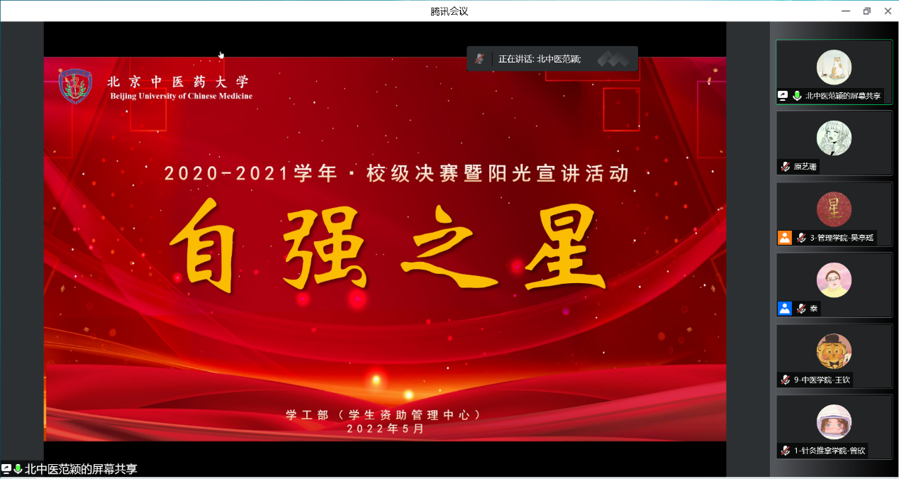 2022年5月18日晚,yl6809永利线路检测第九届“自强之星”决赛评选答辩暨阳光宣讲活动顺利召开。受疫情影响,本次活动通过腾讯会议线上开展。审计处处长申桂英、工会常务副主席艾路、校教育基金会秘书长闫兴丽、宣传部副部长王潇潇、教务处副处长姜珊、学工部副部长赵娜、学工部副部长徐巍、校团委书记宋珊珊出席本次活动,并担任评委。除此之外,与会的还有各学院学生代表及老师。经过初赛激烈的选拔,共有10名优秀的北中医学子来到“自强之星”的决赛现场进行答辩。