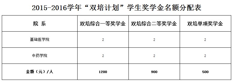 为进一步做好北京高等学校高水平人才交叉培养计划中“双培计划”学生的奖助学金评选,结合首都医科大学与我校奖助特点及实际,现将我校2015-2016学年“双培计划”学生奖学金评选工作的有关要求通知如下: