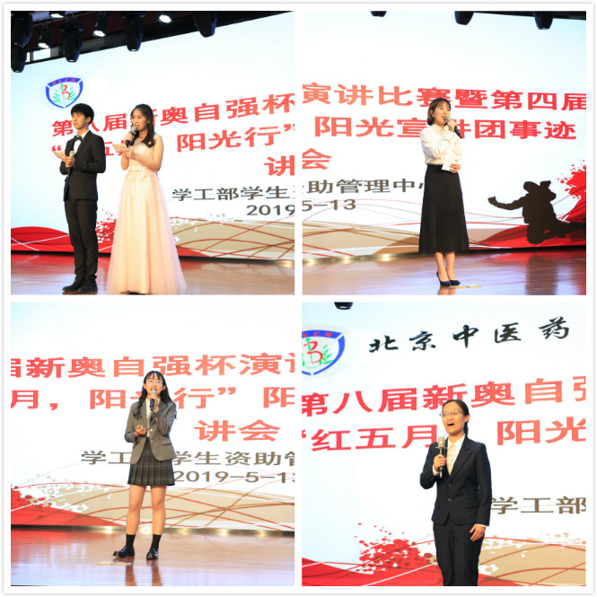 2019年5月13日晚18点,由学工部学生资助管理中心举办、自强社承办的yl6809永利线路检测第八届新奥“自强杯”演讲比赛暨第四届“红五月,阳光行”阳光宣讲团事迹宣讲会于良乡校区学生活动中心四楼报告厅圆满落幕。本次比赛特邀学工部部长李玮、党委宣传部副部长王潇潇、学工部副部长艾华、中药学院党委书记刘雯华、中医学院党委副书记赵建磊、管理学院党委副书记赵静、护理学院副院长李小花、人文学院党委副书记李蔓荻担任此次比赛评委。约400名学生观众前往现场观摩。