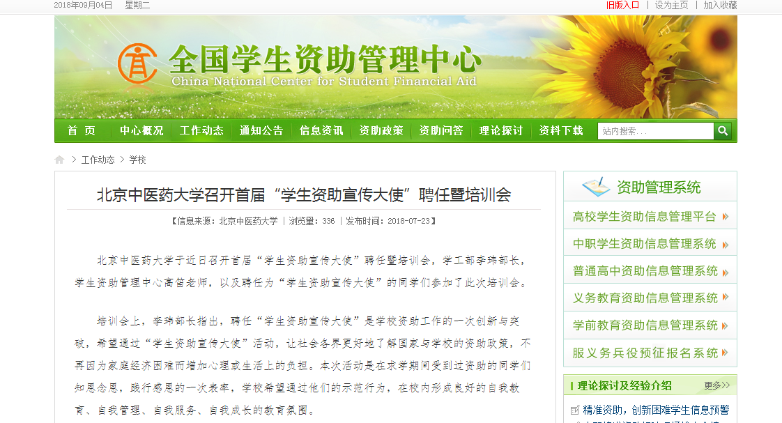 为提高我校学生资助工作质量,创新学生资助工作宣传形式,我校于2018年7月11日启动首届“学生资助宣传大使”聘任及培训工作。此次“学生资助宣传大使”活动,既为了帮助受资助学生全面认识和了解国家及学校的各项资助政策,也是学校资助工作与育人工作的一次有力结合,更是我校资助育人长效机制的一次创新性探索,为接下来学生资助工作的稳步推进提供了保障和支持。2018年7月23日,全国资助管理中心报道我校首届“学生资助宣传大使”聘任暨培训情况。原文如下: