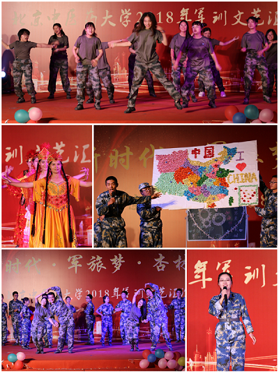 一曲《强军战歌》气势恢宏,唱出了同学们军训十三天的铁血刚毅;武术表演《中华魂》刚劲有力,彰显了华夏五千年的文明传承,展现了北中医学子的铮铮铁骨;原创相声《军训堪回首》、情景剧《无军训,不大学》回忆了十三天军训生活的点滴,并以幽默的方式展现了同学们的成长历程;街舞《LET’S DANCE》、合唱《时间飞行》、古典舞《舞的倾城》以及歌曲串烧《骄阳如我》《莫忘同行》以灵动的舞姿和优美的歌声为汇演注入了勃勃生机;原创校园舞蹈诗《岐黄志》以艺术的形式跨越时空,为同学们展现了中医药的魅力;民乐合奏《北京一夜》、创意表演《古乐书舞情》荡气回肠,激起同学们阵阵掌声。民族舞蹈《大美无疆》,舞出了少数民族同学的杏林魂。参训辅导员的《献给最爱的你们》以舞蹈串烧形式表达了全体指导员对同学们的爱,将晚会氛围推向高潮。