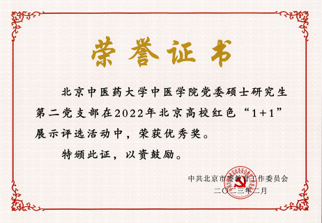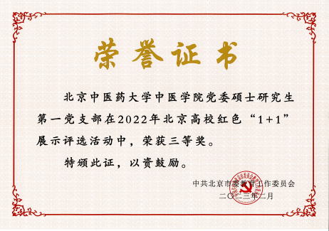 2023年3月7日,由北京市委教育工委主办的2022年北京高校红色“1+1”示范活动结果公布,经由上级评选我校中医学院2个研究生党支部荣获奖项。其中,中医学院党委硕士研究生第一党支部获三等奖,中医学院党委硕士研究生第二党支部获优秀奖。