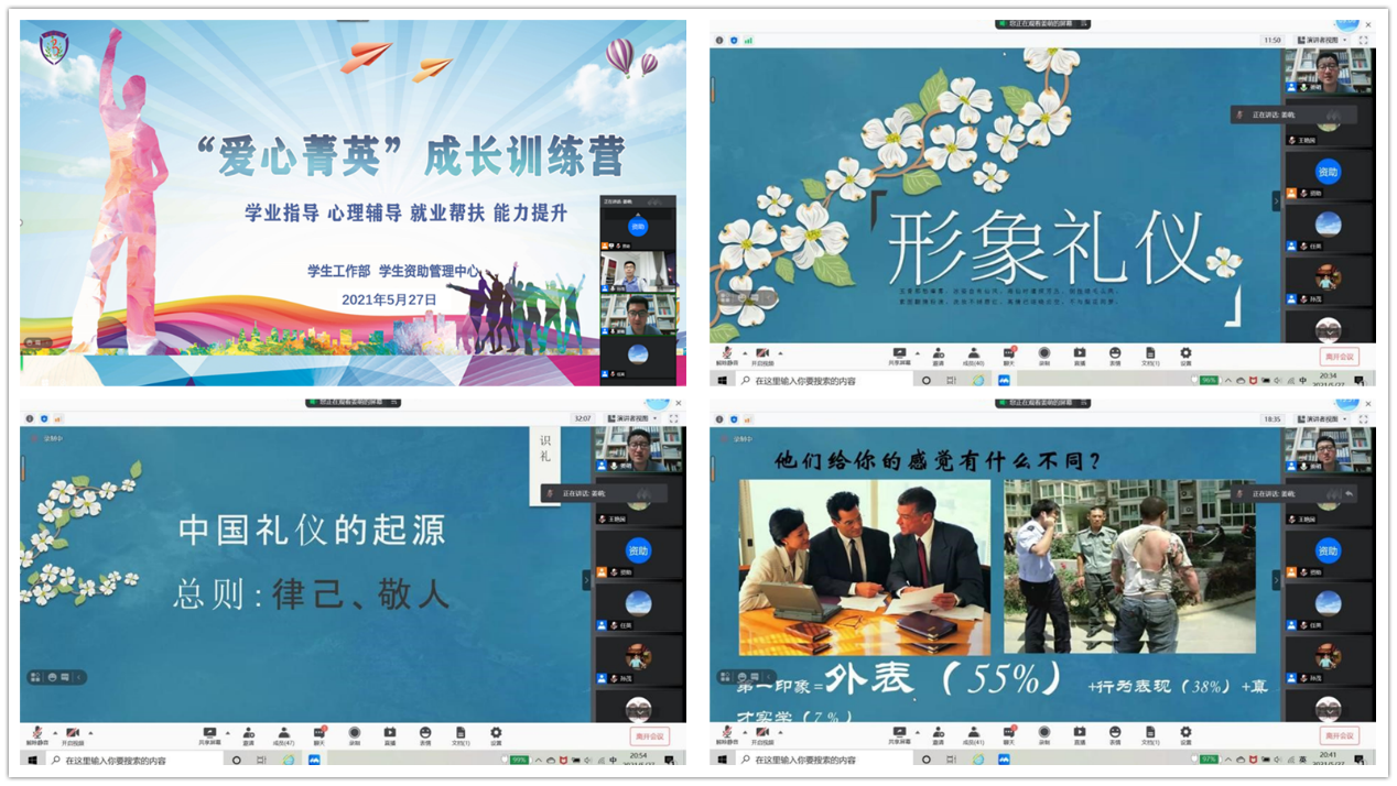 2021年5月27日,学生工作部邀请教育部创新创业导师库导师、全球职业规划师姜萌老师,为同学们开展“爱心菁英”成长训练营第三场讲座——“形象礼仪”主题讲座。学工部资助管理中心孙茂老师,以及“爱心菁英”成长训练营40余名同学参加了本次讲座。