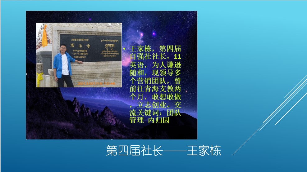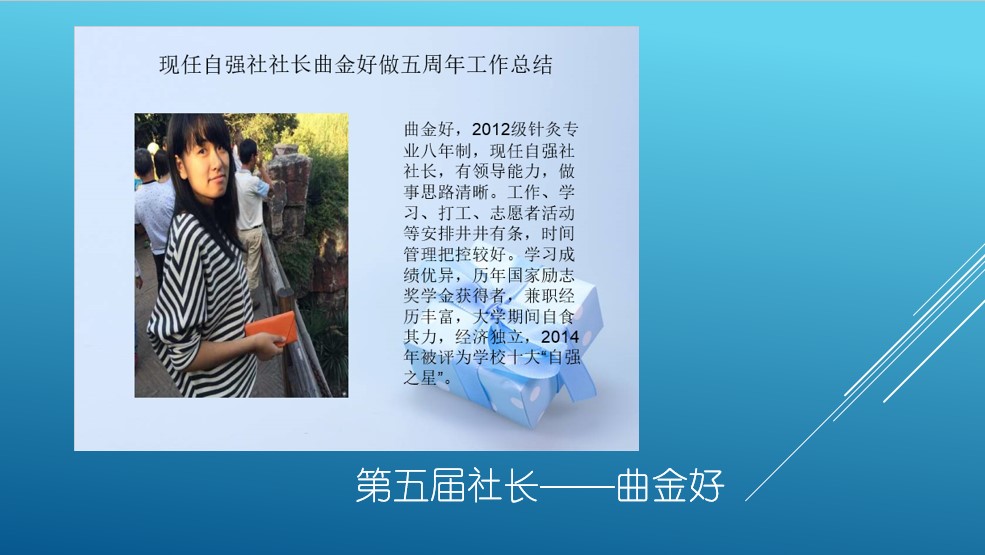 首先,由第五届“自强社”社长曲金好进行“自强社”成立五周年工作总结,“自强社”五年来一直秉承着“自助助人”的宗旨,取得了显著的活动成果,并在老师同学们的共同努力下不断成长。指导老师张美琦也用饱含深情的语言表达了对“自强社”的爱,并对五年来学校对“自强社”的支持帮助以及老师和同学们的辛勤付出表示真心的感谢。