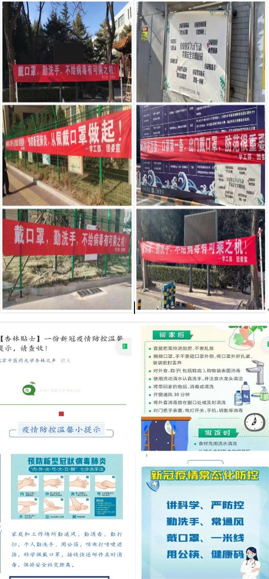 为提升学生们的疫情防控意识,学工部、团委首先在两校区明显位置悬挂疫情防控宣传条幅、海报,开展线下宣传。同时,积极利用线上微信公众号同步推送疫情防控相关提示,通过线上线下相结合的方式多角度对学生进行疫情防控宣传教育,引导学生养成良好的健康卫生习惯,自觉落实“八大”行动。