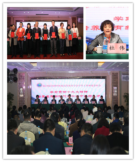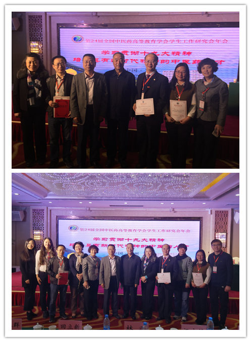 本次年会对2016-2017年度全国高等中医药院校43名优秀辅导员、43名优秀学生工作者、10项特色项目获奖者进行了表彰,宣布了2017年学生工作研究会科研项目中标名单。我校辅导员牛慧君、许珊老师荣获全国中医药高等院校“优秀辅导员”称号,苏萌、谭曦老师被评为全国中医药高等院校“优秀学生工作者”,侯中伟老师申报的《“修身导师”工作模式》被评为全国中医药高等院校优秀特色项目。高笛老师、许美琳老师申报的课题获得年会课题立项。