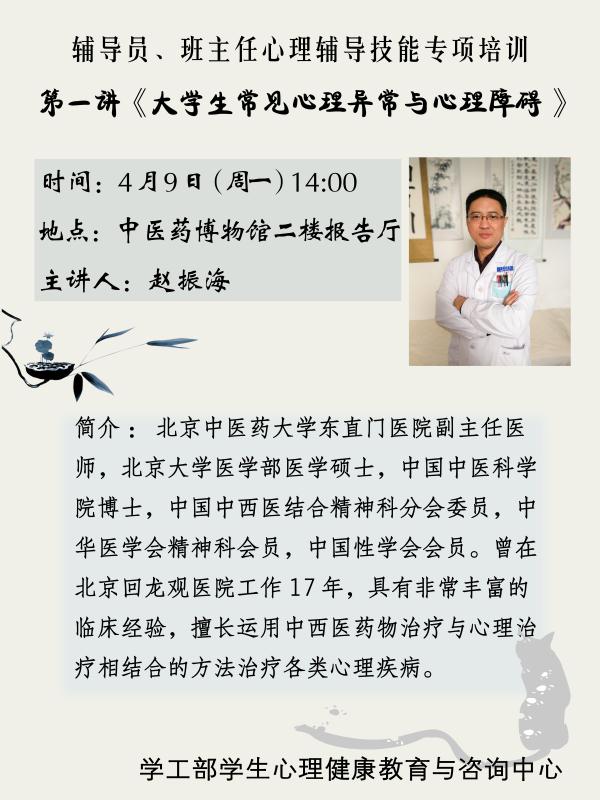 兹定于4月9日(周一)下午2-4点举办《大学生常见心理异常与心理障碍》讲座。主讲人:东直门医院心理门诊,赵振海(副主任医师)。地点:西校区博物馆二楼报告厅。欢迎辅导员、班主任及各位老师踊跃参加!