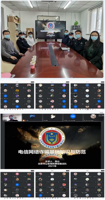 为切实提高我校学生反诈防骗意识,营造平安和谐的校园环境,进一步提升我校学生防范电信网络诈骗能力。2月4日下午,学工部联合保卫处邀请北京市公安局刑警支队高山警官、和平街派出所藏所长、李警官一行来我校和平街校区开展以“电信网络诈骗基础知识与防范”为主题的专题线上讲座。学生工作部部长范璐、保卫处处长高志勇、学生工作部副部长赵娜、学生工作部张春泥老师现场参加讲座,共有315名来自各学院的班级安全委员及部分辅导员老师通过腾讯会议参加了线上培训,活动由学生工作部赵娜副部长主持。