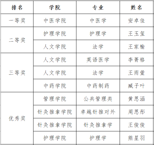 参赛的选手们没有辜负评委和观众们的期望。他们由心而发,用质朴的语言,声情并茂地讲述脱贫攻坚中的感人事迹,慷慨激昂地颂扬建党100年来的伟大成就、社会主义建设中涌现出的英模人物及身边所经历的时代发展变化。他们演讲内容中传递的满满正能量,令在场的每一位评委老师为之动容。演讲结束,老师们针对同学们的演讲内容与现场发挥情况,做出了全面客观的打分与点评,并由衷的对同学们整体表现称赞不已。根据本场比赛最终得分情况,获奖名单如下: