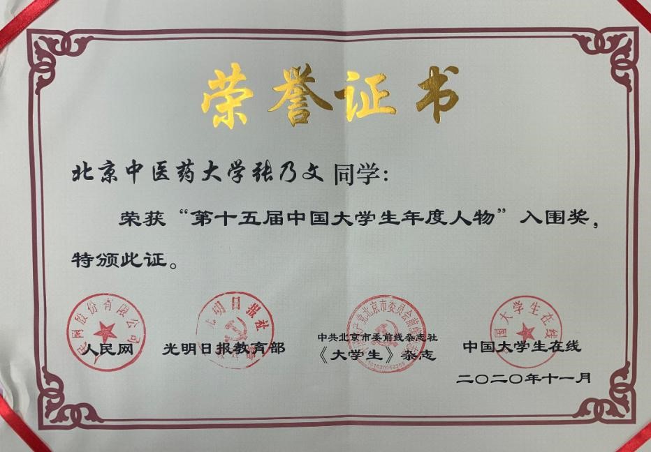 近年来,我校全面贯彻落实全国教育大会精神,坚持立德树人根本任务,全面推进三全育人工作,立足中医药人才培养特色,始终把“培养什么样的人”作为大学生思想政治教育的导向与实践着力点,通过开展各类思政教育活动引导学生主动践行社会主义核心价值观。此次我校张乃文同学荣获“第十五届中国大学生年度人物”入围奖,是对我校思政育人工作的肯定与激励。下一步,学校将以此次获奖为契机,充分发挥先进典型的示范作用,营造比学赶超的正能量校园氛围,号召广大学生以张乃文同学为榜样,在承载着梦想的北中医校园里,脚踏实地,砥砺前行,用实际行动书写无愧于时代的青春华章。
