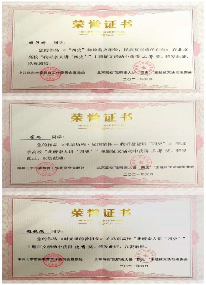 在北京高校“我听亲人讲‘四史’”主题活动中,我校中医学院田子娇、管理学院崔璐、护理学院程姝涵三位同学的作品从北京市征集的近900篇学生征文作品中脱颖而出,分别荣获市级二等奖、三等奖和优秀奖。