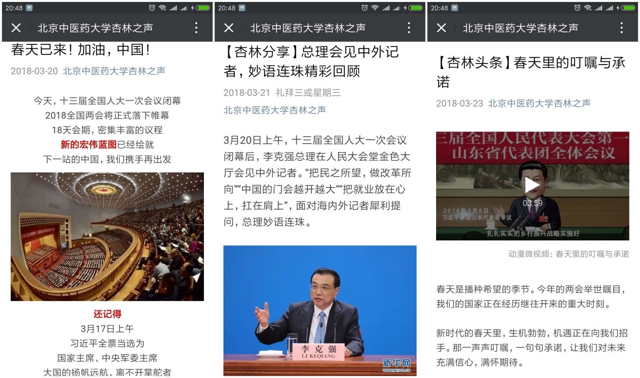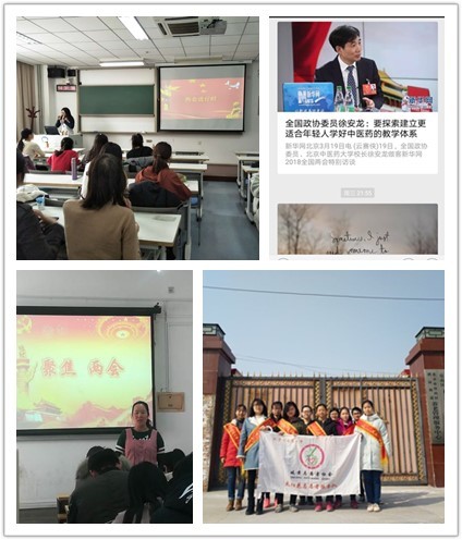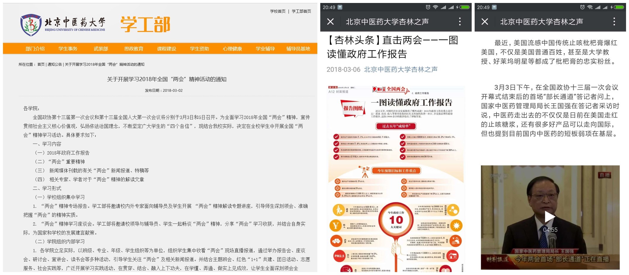 精心设计,营造声势。3月2日学工部下发《关于开展学习2018年全国“两会”精神活动的通知》(京中学发〔2018〕002号),对各学院开展“两会”学习活动提出了工作要求和指导。同时,充分利用新媒体平台优势,在杏林之声上发布“直击两会——一图读懂政府工作报告”、“中医药局局长王国强回答记者问”、“春天已来!加油,中国!”、“总理见中外记者,妙语连珠精彩回顾”、“春天里的叮嘱与承诺”等“两会”主题推送文章,用接地气、聚人气的语言文字表达,“围观两会”,向广大师生传递“两会”资讯,强大宣传和舆论声势。