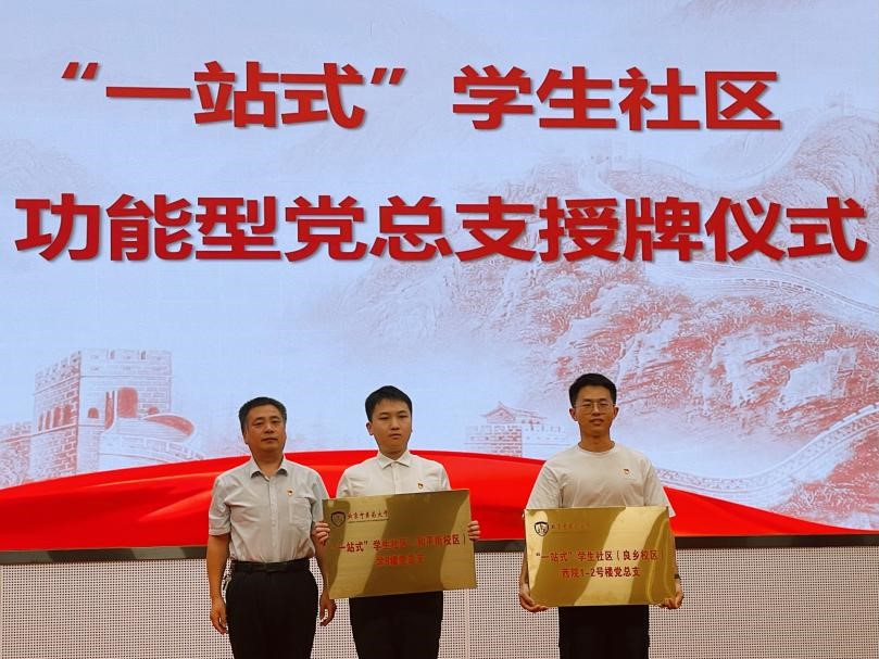 会上,学工部副部长赵娜介绍了“一站式”学生社区功能型党组织试点的设立背景、意义和功能。组织部副部长杨永兴宣读了《关于同意在yl6809永利线路检测成立“一站式”学生社区成立功能型党组织(试点)的批复》及委员建议人选,明确了“一站式”学生社区功能型党组织委员会的组成和职责任务。校党委副书记张继旺为两个楼宇党总支授牌。