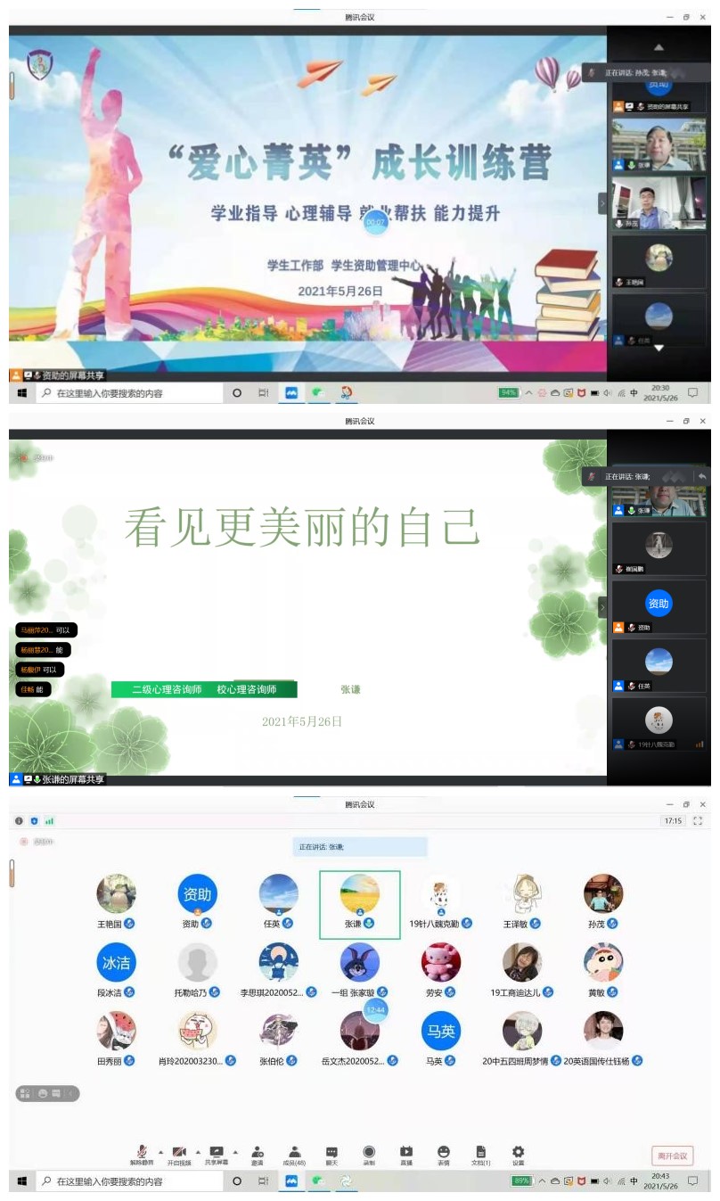 2021年5月26日,学生工作部邀请学校大学生心理咨询中心咨询师、国家二级心理咨询师张谦老师,为同学们开展“爱心菁英”成长训练营第二场讲座——“看见更美丽的自己”主题讲座。学工部资助管理中心孙茂老师,以及“爱心菁英”成长训练营40余名同学参加了本次讲座。