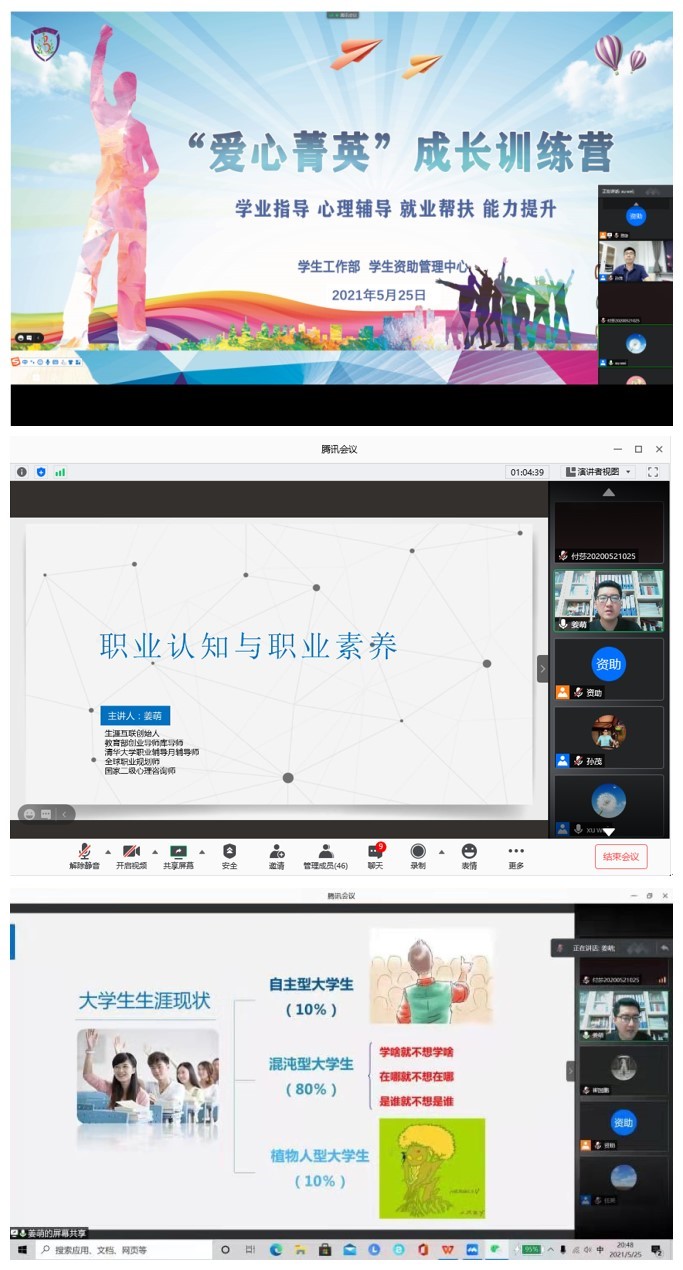 2021年5月25日,学生工作部邀请教育部创新创业导师库导师、全球职业规划师姜萌老师,为同学们开展“爱心菁英”成长训练营第一场讲座——“职业素质及认知”主题讲座。学工部副部长徐巍老师、学工部资助管理中心孙茂老师,以及“爱心菁英”成长训练营40余名同学参加了本次讲座。