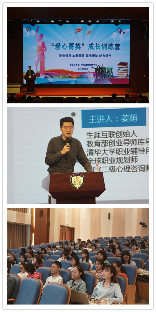 2019年5月15日,学生工作部邀请生涯互联创始人姜萌老师为同学们开展“爱心菁英”成长训练营之“职业素质及认知”主题讲座。学生资助中心孙茂老师以及120余名训练营成员参加了本次讲座。