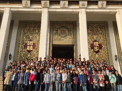 为庆祝新疆维吾尔自治区成立60周年,帮助学生了解新疆维吾尔自治区发展的光辉历程及成就,10月19日下午,我校学工部组织部分来自基础医学院和中药学院的新生,前往民族文化宫参观了“新疆维吾尔自治区成立60周年成就展”。