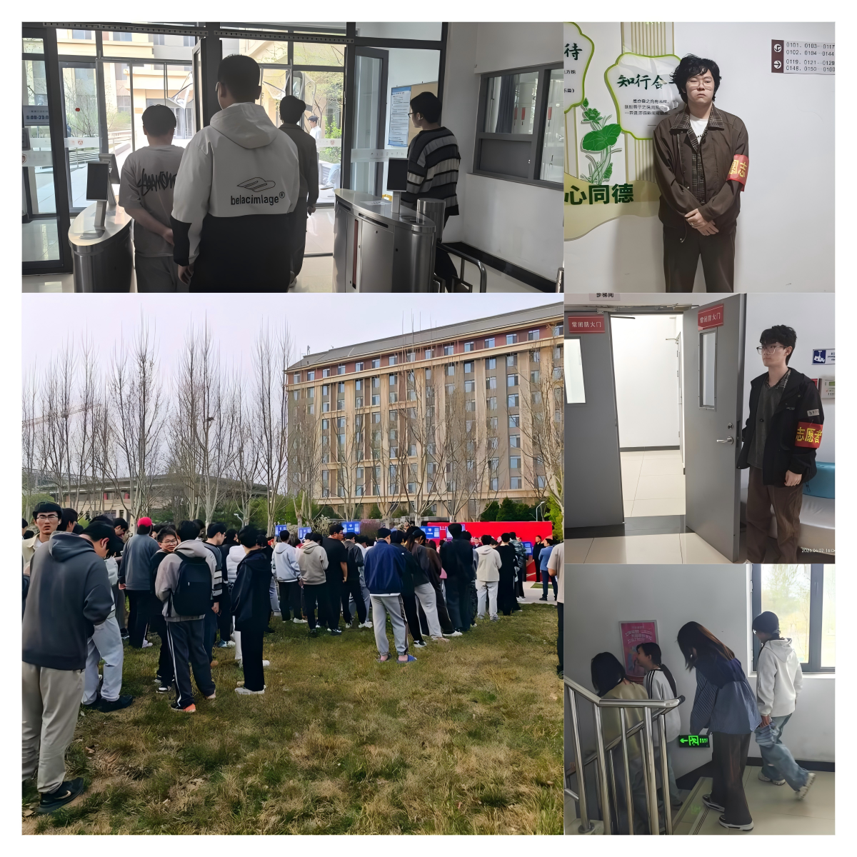 下午16时整,学工部部长赵建磊发出“演练开始!”的指令,随即警报声响起。学1楼、学2楼学生在楼层引导员和志愿者有序组织下,按照预定疏散路线迅速撤离至西院校门与雁地湖之间的中央景观带集结点,并通过扫码完成签到。本次演练共有424名学生现场集结打卡,其中本科生353名、研究生71名,基本实现“应训尽训”目标。整个疏散过程紧张迅速,但平稳有序,未发生拥堵、踩踏等意外情况,充分检验了学生应急避险能力和学校协同处置水平。
