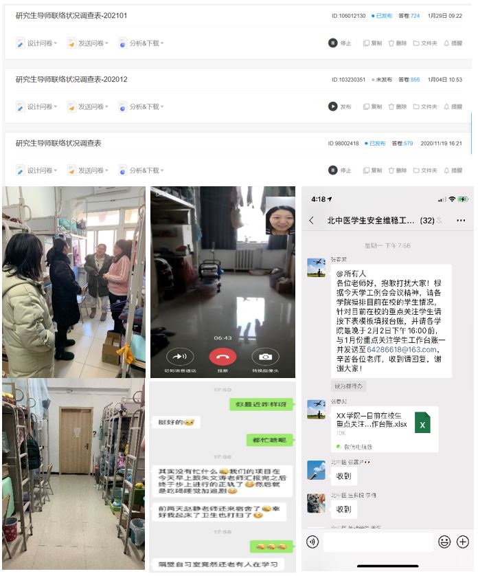 同时,为及时掌握留校研究生的思想动态、学习和生活等情况,学工部组织研究生导师填写“研究生导师联络状况调查表”,将收集的问题分类汇总,及时反馈到相关学院,确保研究生的教育管理工作平稳顺利。建立学生安全工作报送机制,组织各学院报送“重点关注学生台账”,要求学院重视学生问题,对学生的各类问题做好针对性的工作,做到工作有力度、关怀有温度。