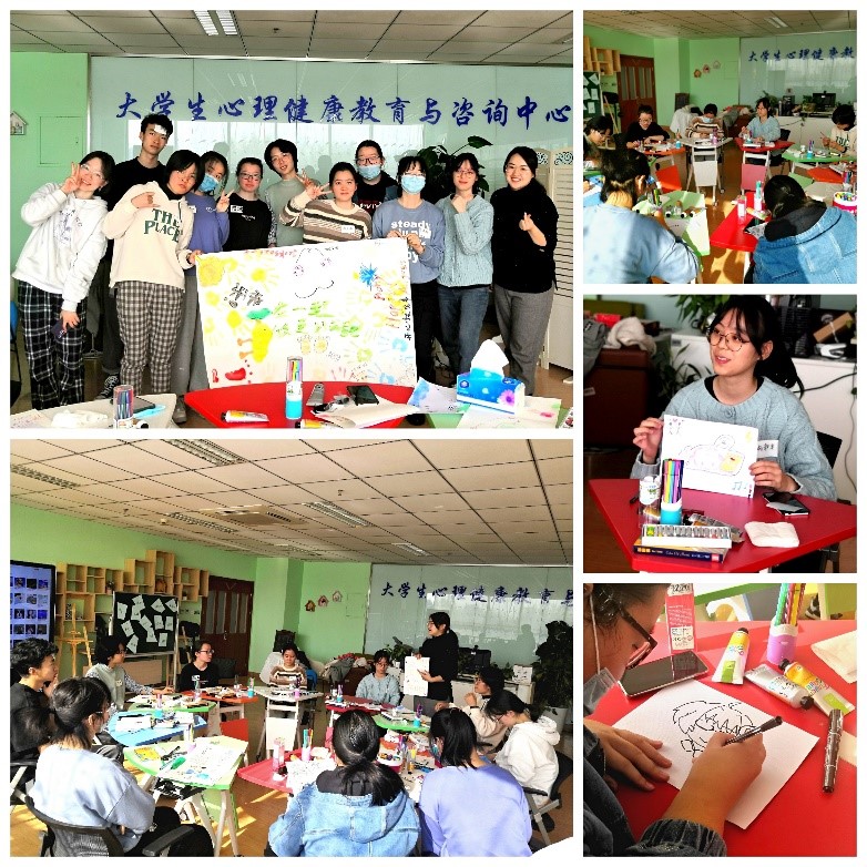本次活动主题为“我的大学生活”,力求从学习、生活和人际关系适应与积极应对方面促进组员的自我探索和成长。活动共分为三个部分:第一部分“画中知己”,鼓励成员们通过自画像的形式介绍、展示自我,敞开心扉,融入团体;第二部分,带领成员以线条、颜色、人物、场景等各种形式任意描绘现在的大学生活,引导同学们畅所欲言“吐槽”在适应大学生活中遇到的各种困惑,引发共鸣;之后,让同学们在事先准备好的非空白纸(带有干扰内容)上描绘自己期待的大学生活,引导同学们积极应对人生中不可预知的困难,发挥创造力,并在完成绘画后彼此交流感受,在其他成员的资源中收获启发,获得成长。最后,由全体组员共同创作一幅画,畅想未来美好的大学生活,活动在一片和谐的氛围中结束。