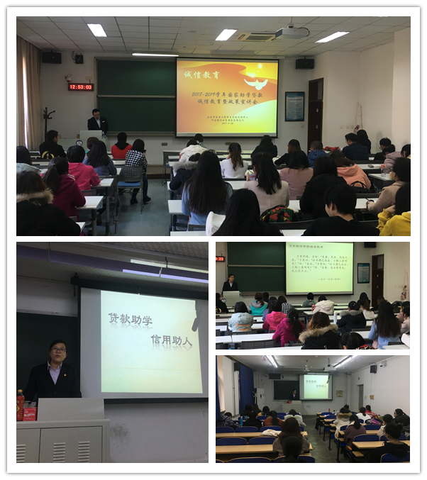 11月22-23日,学工部学生资助管理中心分别在良乡校区、和平街校区举办了2018-2019学年国家助学贷款诚信教育暨政策宣讲会,旨在强化学生诚信意识,进一步做好国家助学贷款签约工作。中国银行朝阳支行个贷部王婧经理、樱花东街支行销贷部金勇经理,为2018级新办理校园地国家助学贷款的学生进行了宣讲。宣讲由学工部学生资助管理中心孙茂老师主持。