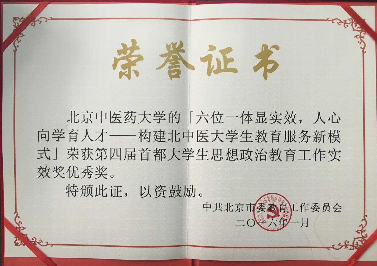 近日,在北京市教工委组织的2016年北京高校宣传教育工作会上,我校六位一体服务育人模式获得北京市教工委高度评价,并被授予第四届首都大学生思想政治教育工作实效奖优秀奖。