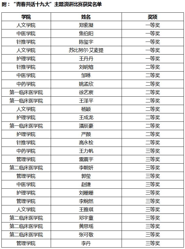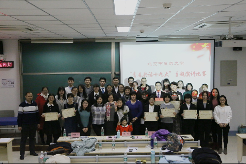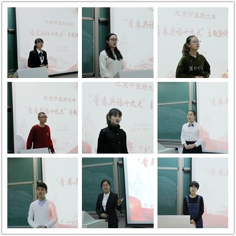 本次演讲比赛分为学院初赛和学校决赛两个环节。最终在学院初赛的基础上,共有来自中医学院、中药学院、针灸推拿学院、管理学院、护理学院、人文学院、第一临床医学院、第二临床医学院等八个学院的27名选手参赛。比赛中,27名参赛选手围绕“青春共话十九大”的主题,以优美的语言,真挚的情感,各具魅力的演讲,展现当代青年对党的十九大精神的理解与思考,抒发心中的报国志和爱国情,用青春的宣言诠释新时代中医药人的承诺与担当。他们当中,有来自新疆的少数民族学生,用自己的成长和求学经历表达了对党的感激之情和继续努力为民族团结贡献力量的决心;有来自偏远农村地区的学生,用饱含真情和自豪的语言向在场师生们述说着在党的领导下家乡的巨大发展变化;来自医学类专业的学生,结合自己的专业学习和实践的经历,表达了对十九大深化医改的拥护和支持,立下“先发大慈恻隐之心,誓愿普救寒灵之苦”的决心……整场比赛中,选手们或激昂高亢,或低沉吟诵,用真情歌颂党的十八大以来我国取得的辉煌成就,抒发对党的炽热情怀,表达了“一颗红心跟党走,砥砺奋进志不移”的坚定信念,充分展现了我校学生紧随时事政治,保持思想先进的优良品质。选手们极富有感染力的精彩表现也赢得了在场师生的阵阵掌声。