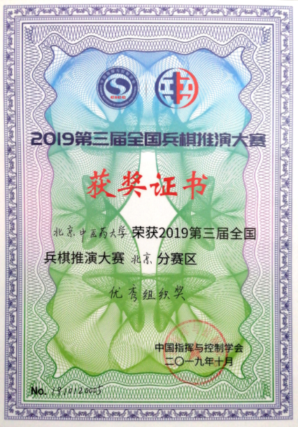 2019年10月28日下午,第三届全国兵棋推演大赛北京赛区总决赛暨颁奖典礼在北京理工大学举办。我校中医学院2019级博士生张凯文勇夺个人赛冠军(特等奖)、编队赛季军(一等奖),2018级本科生林德龙获个人赛二等奖,同时我校还获得了优秀组织奖、优秀战报一等奖、优秀解说员奖等奖项。